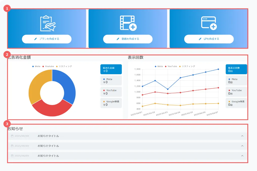 ダッシュボードは大きく以下の3エリアで構成されています。