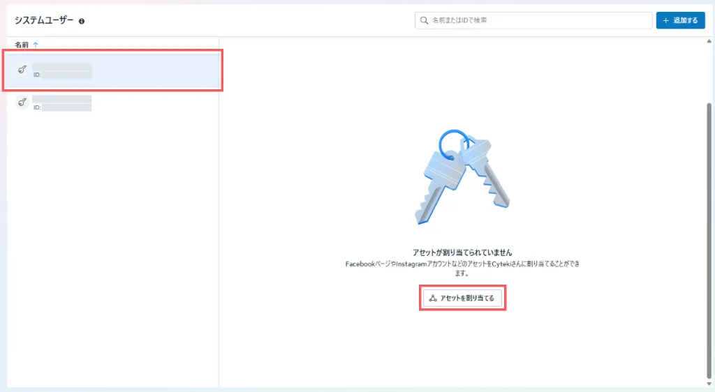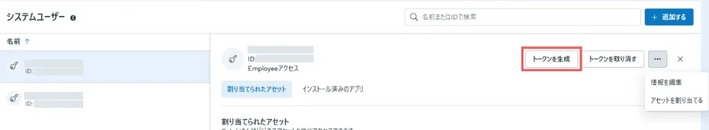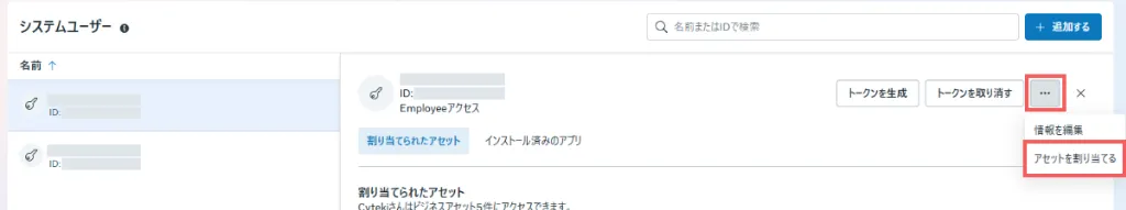 ①作成したシステムユーザーをクリックし、「アセットを割り当てる」を押します。