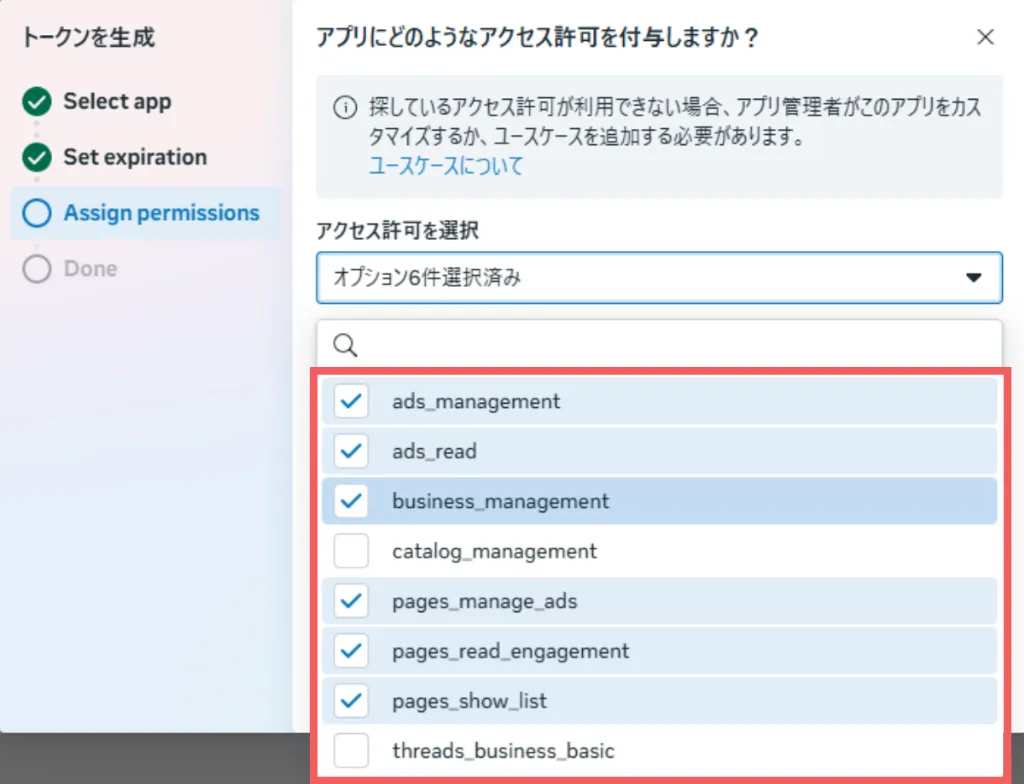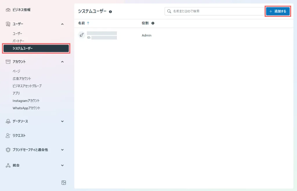 Metaビジネスマネージャでシステムユーザー作成を行ってから、アクセストークンを発行します。