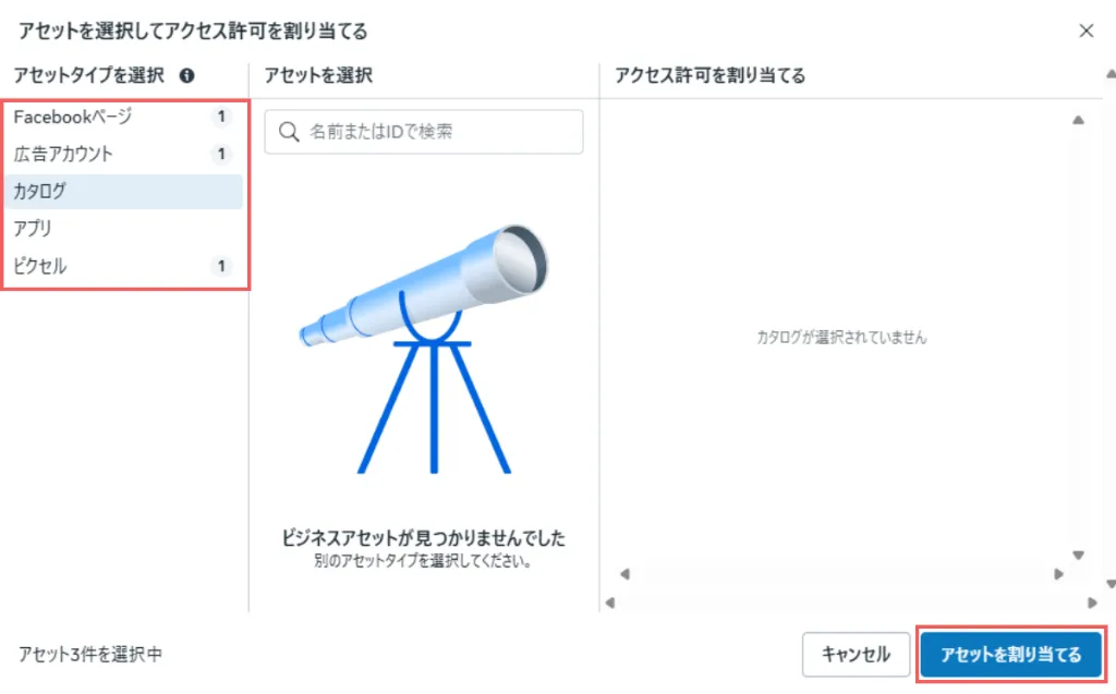 既に割り当てられている場合は右側に表示されているユーザーの「…」を押して「アセットを割り当てる」を押します。