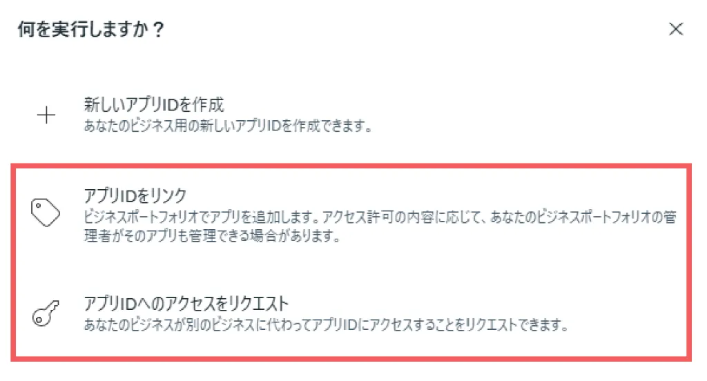 ②「アプリIDをリンク」または「アプリIDへのアクセスをリクエスト」を選択肢します。
