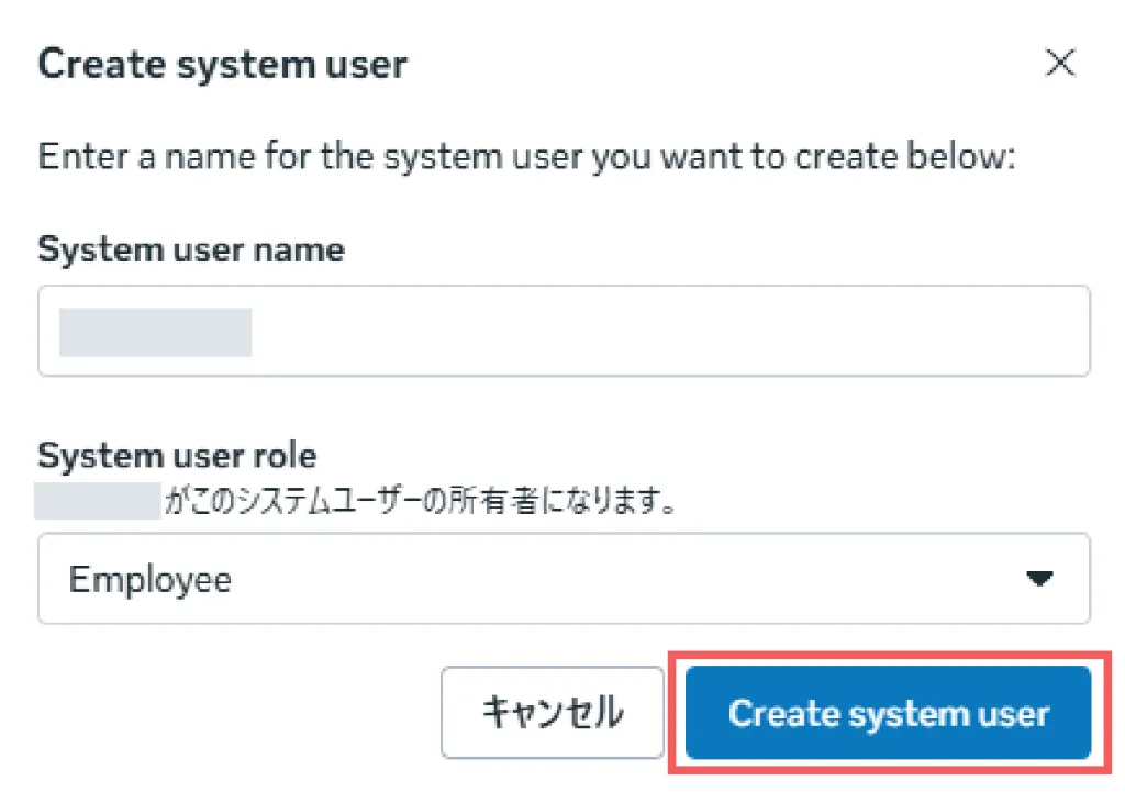 システムユーザー追加画面が表示されるため、「Create system user」を押します。