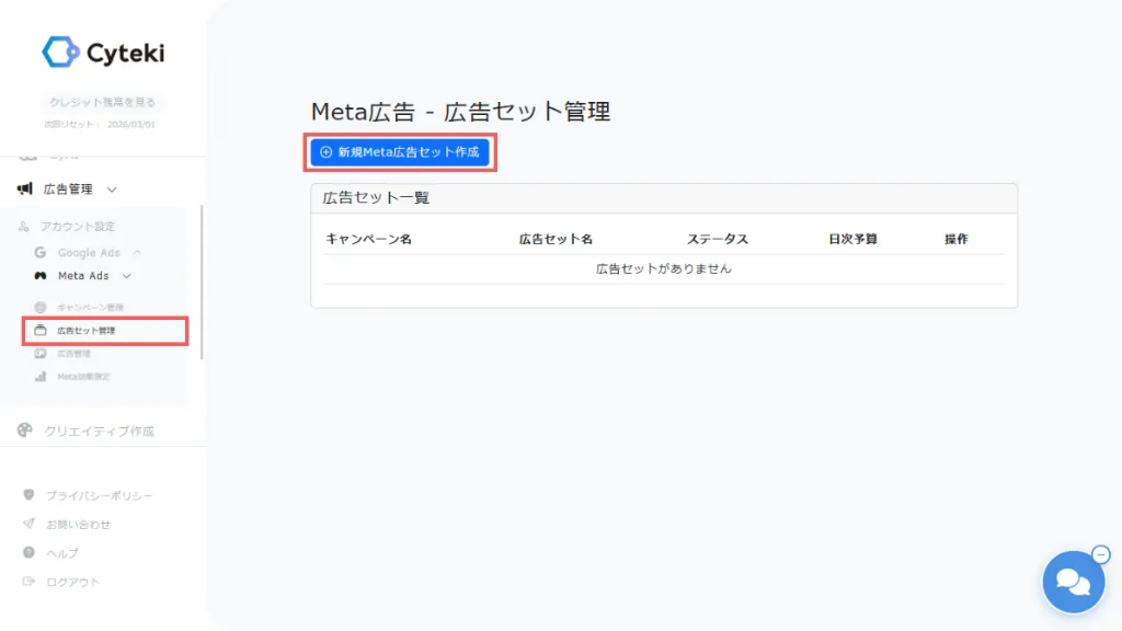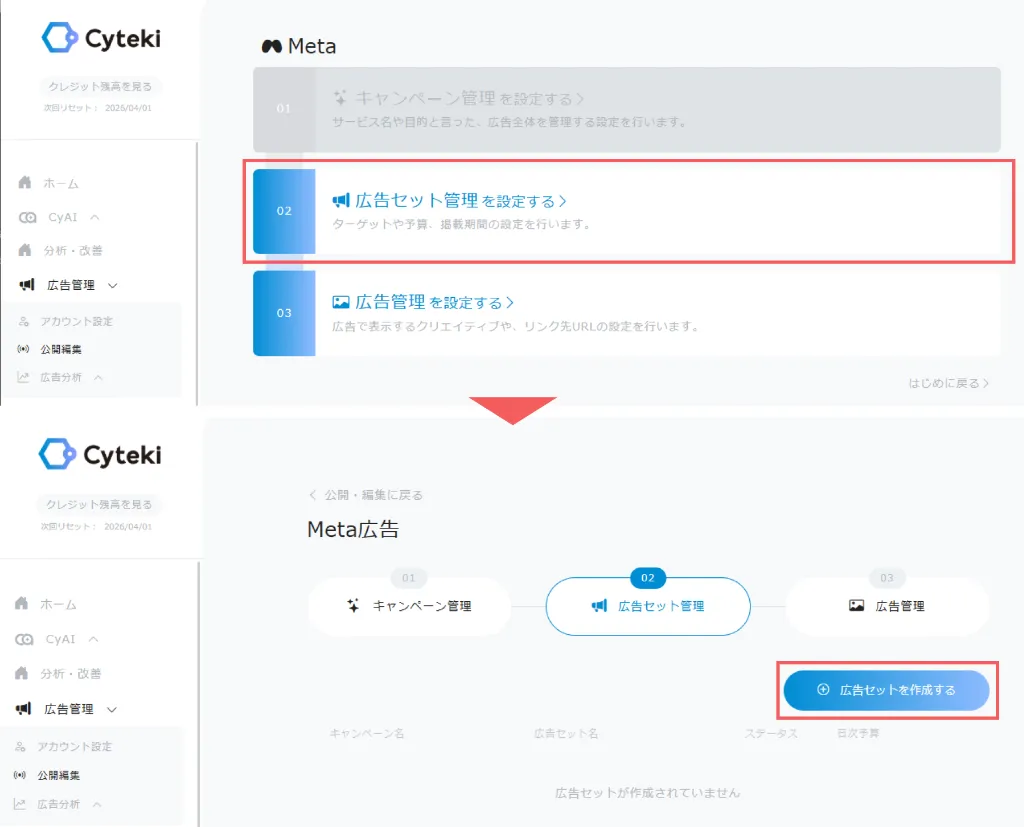 広告セットはキャンペーン内の広告をまとめる単位です。ターゲット設定や予算配分を管理します。