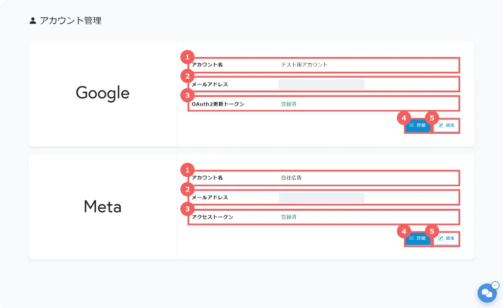 Google/Metaアカウントの登録・状態を一覧で確認できます。