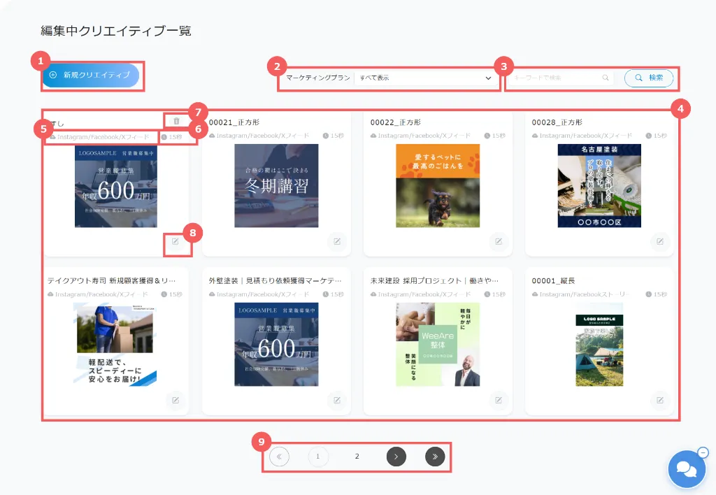 ページ番号をクリックすることで、前後のクリエイティブ一覧を切り替えて確認できます。