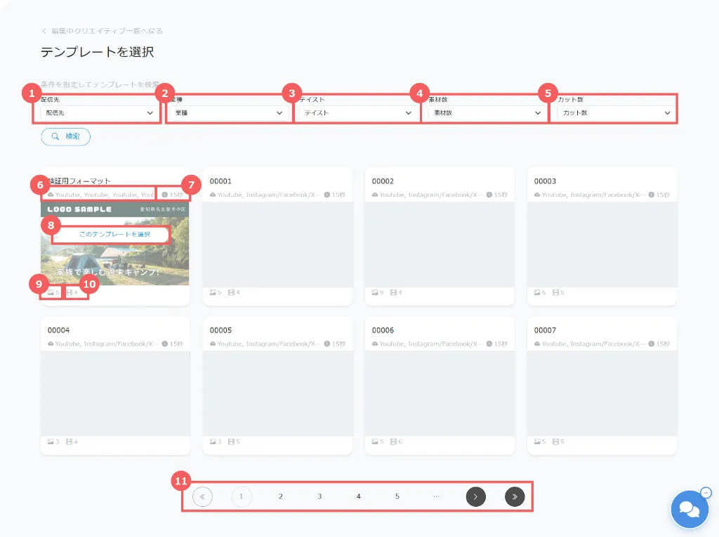 配信先に適した動画比率(横型・縦型など)や尺テンプレートが瞬時に把握でき、媒体ごとに最適化されたデザインを選びやすくなります。