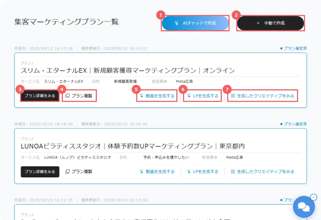 クリックすると、チャット形式でマーケティングプランを新規作成できます。
