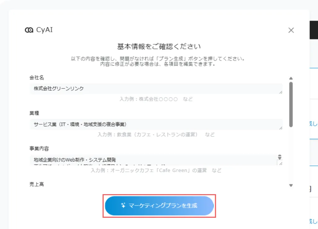 あらかじめ設定をしている会社情報(業種・事業内容など)を活用して、CyAIが内容の提案を行います。