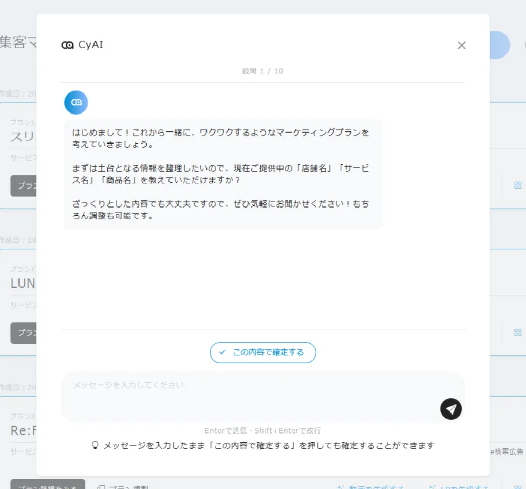 設問に対してすでに内容が決まっている場合は、メッセージを入力したまま送信せずに「この内容で確定する」ボタンを押すと、CyAIとのやりとりを飛ばして内容を確定することができます。