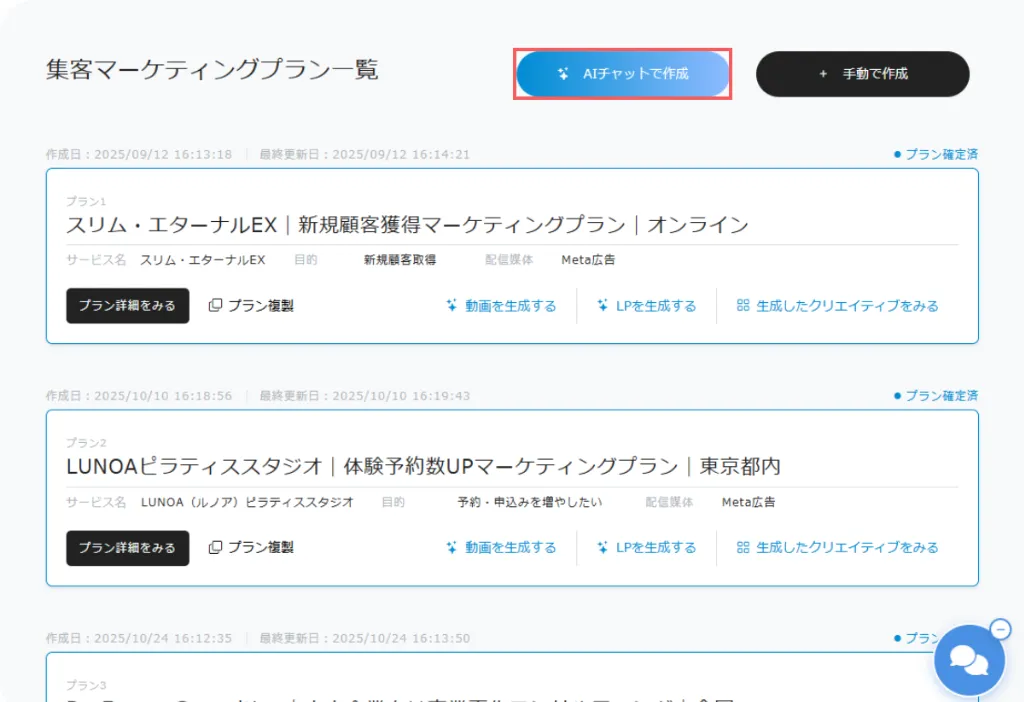 管理画面上部の 「AIチャットで作成」 ボタンをクリックします。