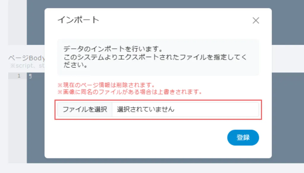 2.ファイルを選択できる画面が表示されるため、別のページからエクスポートしたzipファイルを選択し、「登録」を押します。