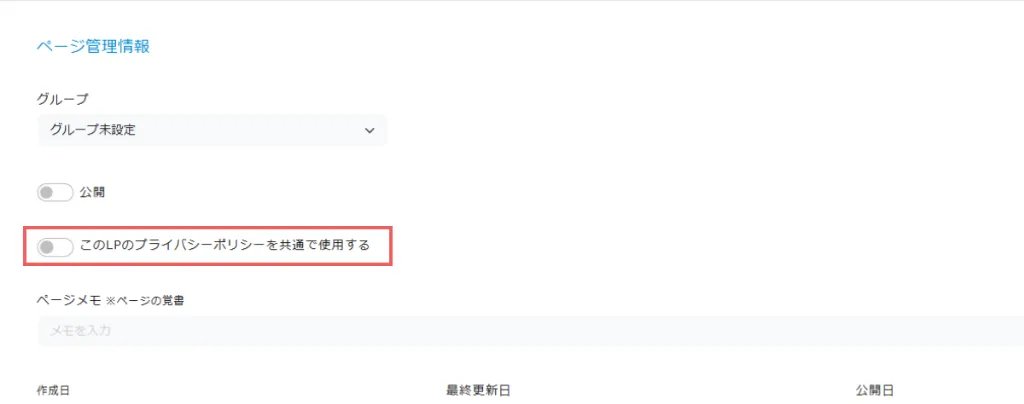 ※LP内にプライバシーポリシーのブロックが存在しない場合と、すでに別のLPでプライバシーポリシーの共通設定をしている場合はこの設定は行えません。