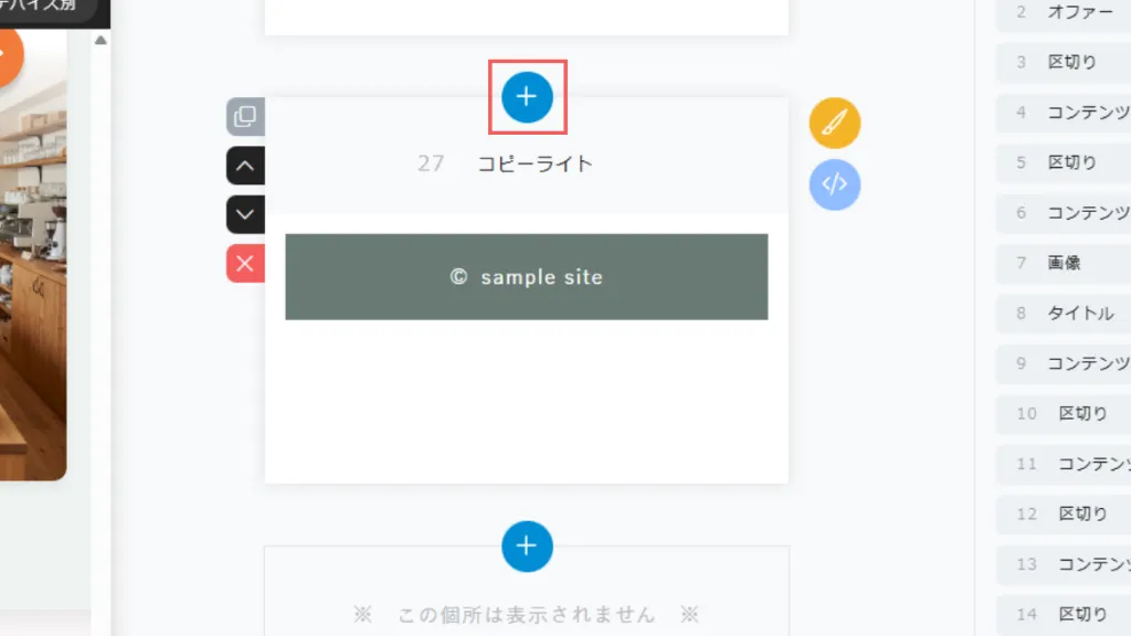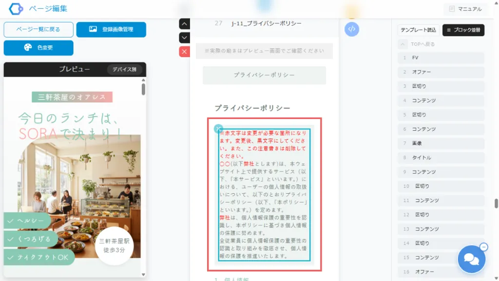 プライバシーポリシーの共通設定を行ったあとに、別のLPの編集画面にてプライバシーポリシーのブロックを追加すると、共通元の内容でブロックが設置されます。