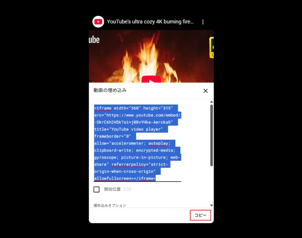 表示された埋め込み用コードの右下にある「コピー」ボタンを押します。