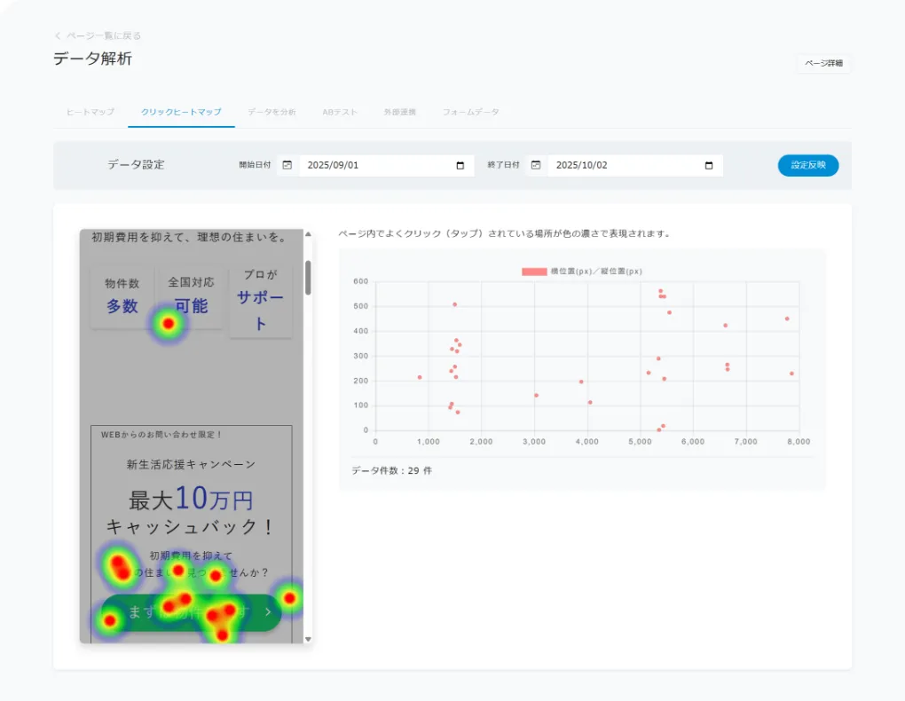 ページ内でよくクリック(タップ)されている場所が色の濃さで表現されます。