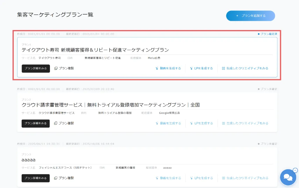 プラン一覧画面の「LPを生成する」ボタンをクリックし、LPを生成してください。
