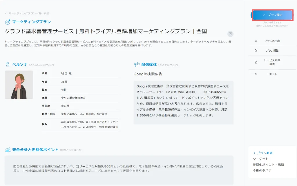 AIがマーケティングプランに基づき、構成とテキストを生成します。