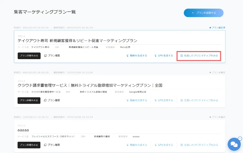 3. プラン一覧画面から「LP生成」ボタンをクリック
