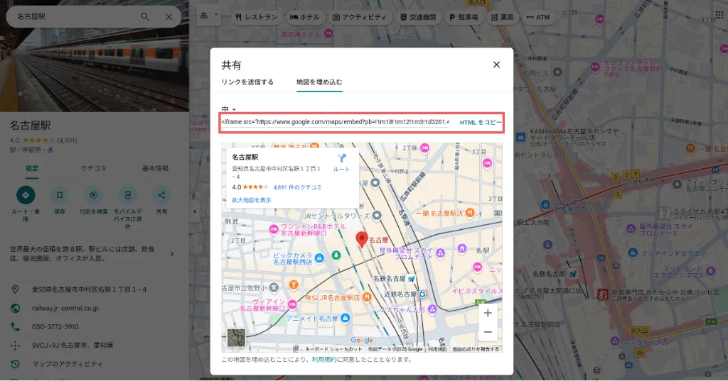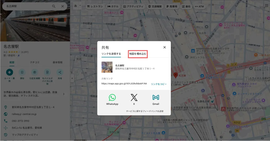 表示されたウィンドウで「地図を埋め込む」タブをクリックします。