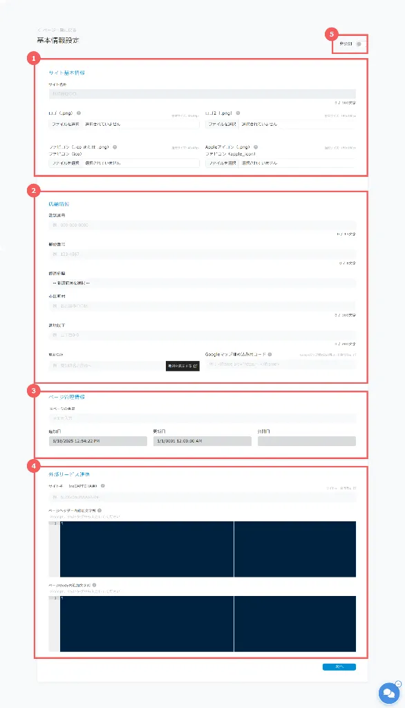 ・サイト名称:HP全体の名称を入力します。例:「○○サービス公式サイト」。