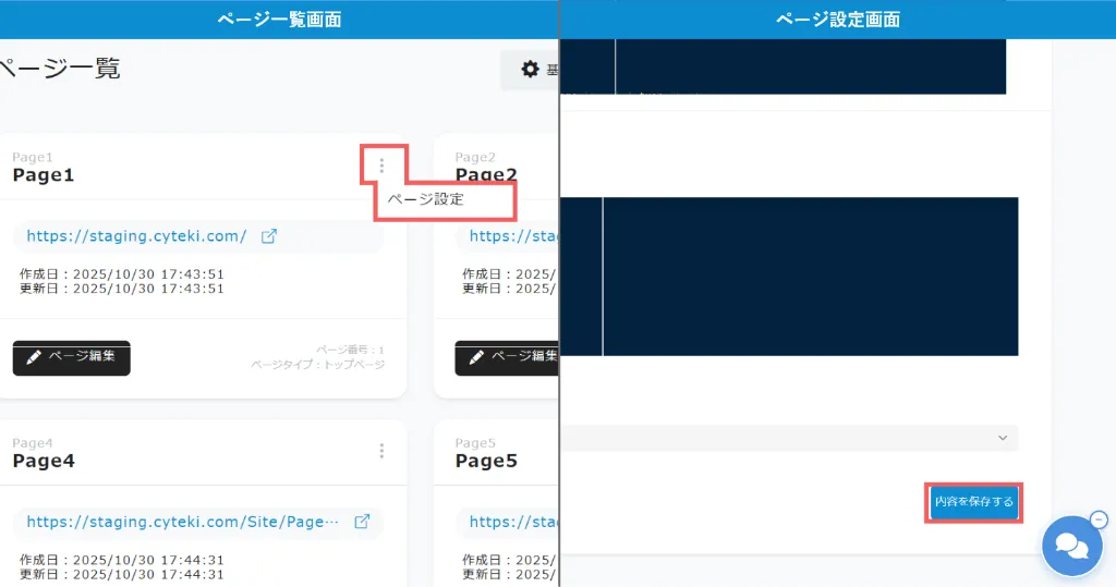 ページ一覧画面から対象ページの「ページ設定」ボタンをクリックします。