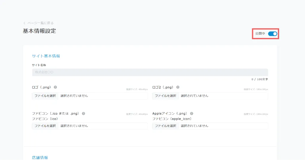 基本情報設定画面の右上にある「公開」スイッチをクリックし、ONの状態にします。