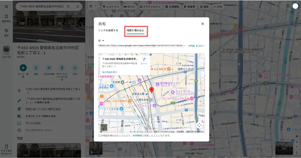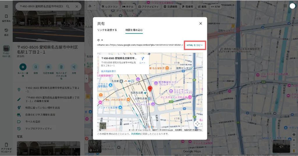 以下の手順を参考に、Googleマップの埋め込みコードを取得し、HPに貼り付けてください。