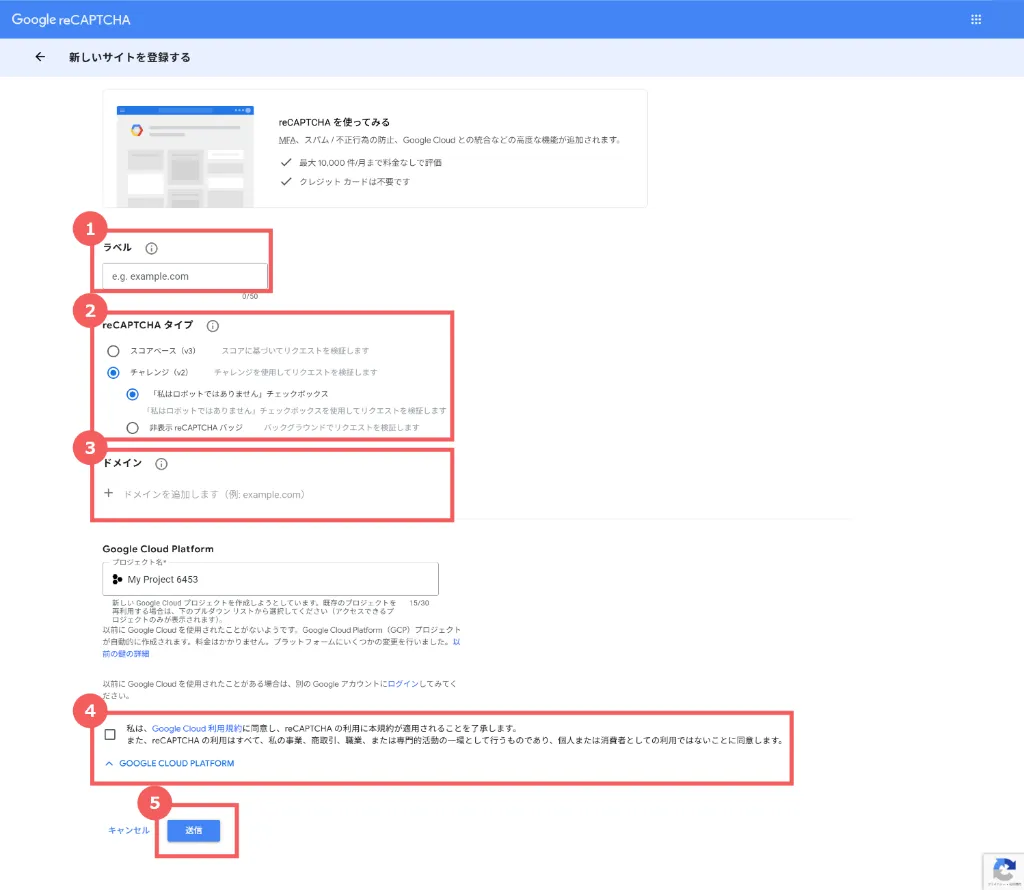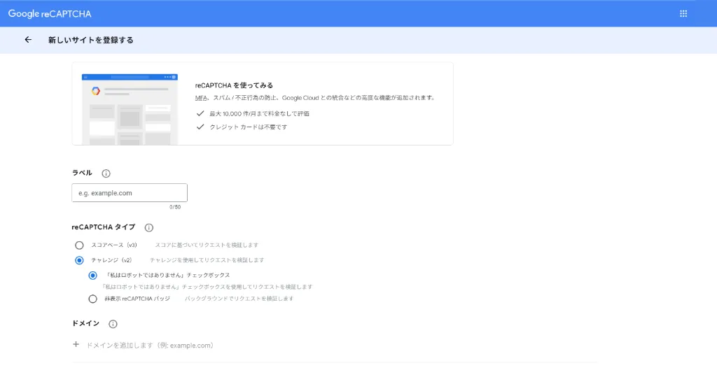 ここでは、Google reCAPTCHAのサイトキーの発行方法を説明します。