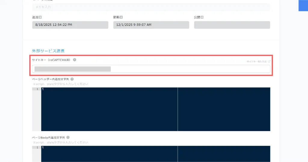 3.「外部サービス連携」内の サイトキー欄 にコピーしたキーを貼り付け