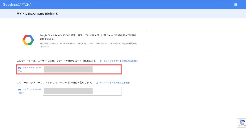 ※サイトキーはサイトの安全性に関わる重要な情報です。他人に共有したり、第三者へ知らせないようにしてください。